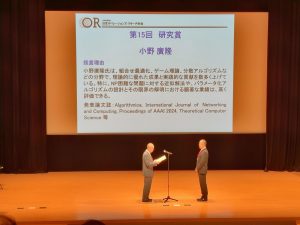 小野廣隆教授が組合せ最適化,ゲーム理論,分散アルゴリズムなどにおける理論的・実践的な貢献,特にNP困難な問題に対する近似解法・パラメータ化アルゴリズムの設計とその限界の解明に関する研究により,日本オペレーションズ・リサーチ学会で最も歴史のある賞である研究賞(大西記念文献賞,文献賞より改称)を受賞しました。